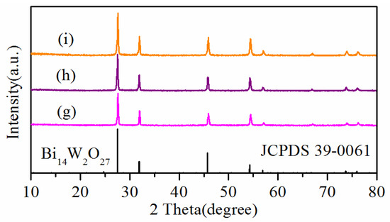 XRD patterns of prepared Bi14W2O27 samples under different temperature and pH. (g) 140 °C, pH = 13; (h) 180 °C, pH = 13; (i) 220 °C, pH = 13.