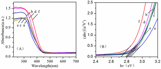 UV–Vis diffuse reflectance spectra (A) and plots of the (ahv)2 (e2V2) versus hv (eV) (B) of Bi2WO6 synthesized at different temperature and pH values. (a) 140 °C, pH = 1; (b) 140 °C, pH = 7; (c) 180 °C, pH = 1; (d) 180 °C, pH = 7; (e) 220 °C, pH = 1; (f) 220 °C, pH = 7.