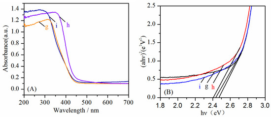 UV–Vis diffuse reflectance spectra (A) and plots of the (ahv)2 (e2V2) versus hv (eV) (B) of Bi14W2O27 synthesized at different temperature and pH values. (g) 140 °C, pH = 13; (h) 180 °C, pH = 13; (i) 220 °C, pH = 13.