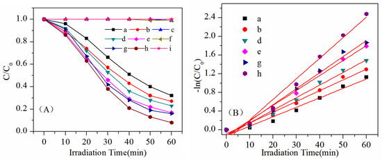 The photocatalytic activities of the as-prepared catalysts under different temperature and pH values were comparatively evaluated by simultaneous degradation of MB under UV light irradiation. Figure 6A displays the degradation of MB within 60 min over different catalysts. It can be concluded that Bi2WO6 shows outstanding photocatalytic activities under UV light irradiation, while Bi14W2O27 has almost no photocatalytic activities. In addition, Bi2WO6 catalysts synthesized by different pH values and temperatures show different catalytic performance. Clearly, after 60 min of reaction, the MB degradation efficiency approaches 91.6% (Figure 6h), higher than those achieved by using Figure 6g (84.5%), Figure 6e (83.3%), Figure 6d (77.3%), Figure 6b (72.5%), and Figure 6a (67.6%). In general, when Bi2WO6 is synthesized at the same temperature, pH = 7 shows better photocatalytic activities. When the catalyst is synthesized at the same pH, the higher synthetic temperature contributes to better catalytic activity.