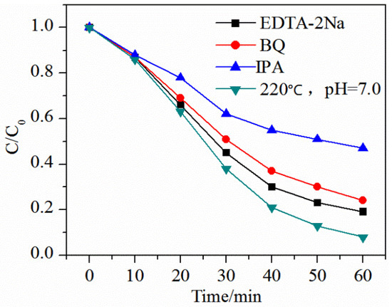 In order to further identify the reactive species during this reaction, we conducted the free radical capture experiments. Benzoquinone (BQ, 1 mM) as hydroxyl radical (•OH) scavenger, benzoquinone (BZQ 1 mM) as superoxide radical (•O2−) scavenger, and disodium ethylenediamine tetraacetate (EDTA-Na2 1mM) as hole (h+) scavenger were added, respectively, in the above-mentioned reaction. It can be illustrated from Figure 7 that three radicals including •OH, h+ and •O2− showed an improved photocatalytic performance, while the MB removal yield significantly decreased to 48.0%, from 91.6%, in the presence of IPA, suggesting that •OH should be the dominant photoreaction radical species, and the addition of EDTA-Na2 and BZQ displays weaker effect on the MF degradation, which indicates that h+ and •O2− contribute little to the degradation reaction.