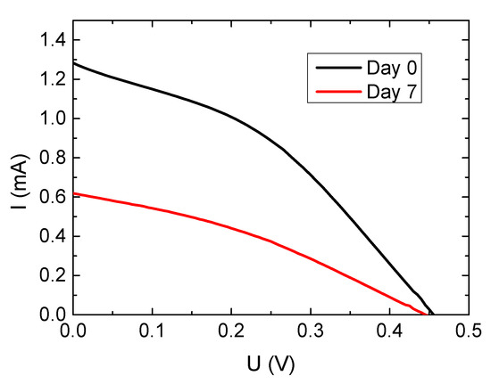 It should also be mentioned that the decrease in short-circuit current is less pronounced than for the glass/nanofiber DSSCs, as depicted in Figure 3. The fully electrospun cell is significantly more stable within the first week of measurements. This measurement period, however, has to be extended to longer test series in future experiments.