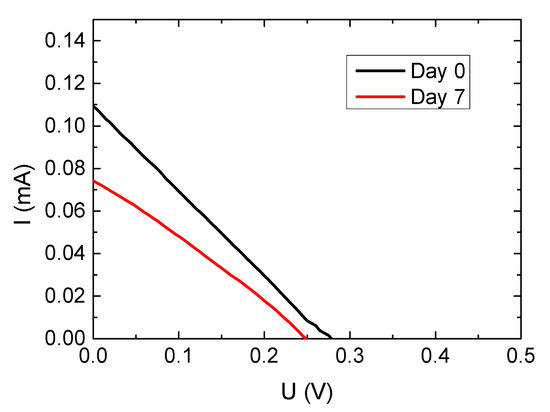 Next, Figure 3 depicts the current-voltage curves measured for the semi-nanofibrous DSSC. While the short-circuit current is reduced by one order of magnitude compared to the purely glass-based cell, it must be mentioned that the characteristics show a solar cell, not just a resistance, as it would be the case for a direct contact between the conductive part of the nanofiber mat and the conductive fluorine-doped tin oxide (FTO) glass. Generally, this DSSC works as a solar cell.