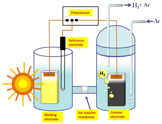 The standard configuration of a photoelectrocatalytic cell for hydrogen production involves a photoanode electrode carrying a semiconductor photocatalyst and a cathode electrode where reductive reactions are carried out, producing hydrogen. Both electrodes are immersed in an electrolyte, which increases the internal cell conductivity and provides the ionic species necessary to allow device functioning in a cyclic manner [3,4]. Figure 1 shows a simplified design of a photoelectrocatalysis cell. When photons are absorbed by the photocatalyst, electron-hole (e−-h+) pairs are generated. Holes are consumed by oxidation reactions, such as (2) or (3), while electrons move through an external circuit and are consumed by reduction reactions at the cathode. The overall result of oxidation and reduction can be represented, for example, by combining (2) or (3) with (4) or (5), respectively [2]: