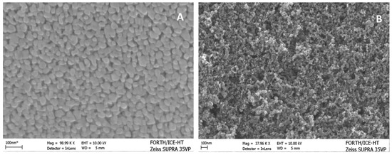 In the present work, as already said, the photoanodes were made either by deposition of a WO3 nanoparticulate film alone on an FTO electrode or by adding a layer of nanoparticulate titania on the top. As seen in Figure 2A, WO3 nanoparticles were polydisperse with the size ranging between 20 and 50 nm. The BET specific surface area was 26 m2g−1, and X-ray diffractograms (not shown) revealed the formation of monoclinic WO3 crystallites of size around 25 nm as calculated by using Scherrer’s formula. The quantity of WO3 in the film was approximately 4.5 mg cm−2. When the titania layer was added on the top, a complete coverage of the lower WO3 film was obtained by exposing only the titania film. The SEM image of the film in Figure 2B then showed a typical titania nanostructure. The quantity of titania was approximately 4 mg cm−2. The latter maintained the characteristics previously described in other publications [21,22]. The thickness of the combined semiconductor film was approximately determined by its scanning electron microscope profile, and it was below 1 µm.