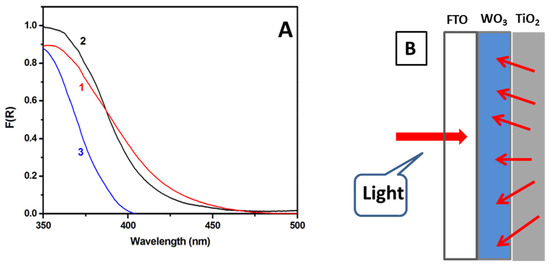 The spectroscopic characteristics of the WO3 film before and after titania deposition are shown in Figure 3A. WO3 film alone absorbed light up to about 480 nm, i.e., within a spectral range typical of this semiconductor. When titania was added on the top, the reflectance-absorption spectrum presented a different aspect depending on which side of the film was exposed to light. When the light passed through the transparent FTO electrode (cf. Figure 3B), the spectrum (Curve 2) showed similar characteristics as those of WO3 alone (Curve 1). Since the photoanode operates by this mode (Figure 3B), it was seen that the spectroscopic characteristics of WO3 prevailed. When absorption was recorded by front reflection, i.e., by means of the top titania layer, the corresponding curve (Curve 3) had a typical aspect of a nanocrystalline titania film. This is an additional indication of complete coverage of the WO3 layer by (the light scattering) titania.
