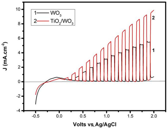 The beneficial effects that the bilayer photocatalyst film had on the activity of the photoelectrocatalytic cell were immediately seen by recording current-voltage curves, as seen in Figure 4. More than a 30% increase of current was recorded when the titania layer was added on the top, compared with a photoanode made of WO3 alone. The curves of Figure 4 were recorded under the same conditions, differing only by the composition of the photocatalyst film. The curves were recorded in light chopping mode demonstrating that the voltage range of pure photocurrent extended between about 0.2 and 1.8 volts vs. Ag/AgCl. The small anodic peak below this range was due to capacitance current deriving from the adsorption of cations from the electrolyte into the pores of the mesoporous film [21]. The increase of the dark current above 1.8 V vs. Ag/AgCl was due to electrolysis. The electrolyte was 0.5 M NaClO4 with 5% v/v ethanol added in the anode compartment. In accordance with previous publications [19,20], in the absence of ethanol (not shown; cf. the data in [19]), lower currents were obtained in both photoanode cases. This was expected as previously explained [19,20]. Ethanol acted as a hole scavenger, which further limited charge recombination, thus resulting in higher currents. Moreover, transient species formed by ethanol oxidation induced current increase by the “current doubling” phenomenon [31]. Indeed, the maximum current density expected for a photoanode with light absorption threshold at 480 nm (cf. Figure 3A) was no more than 5 mA cm−2 [4]. However, the current density presently increased under bias well beyond this limit, and this was rationalized only by the current doubling effect. The addition then of the titania layer and the presence of the fuel (ethanol) resulted in the production of substantial photocurrent.