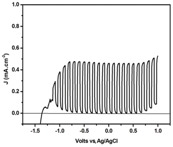 Current density-voltage curves for a photoelectrocatalytic cell made of a (pure) titania photoanode. Recording was done in light chopping mode demonstrating the voltage range of the pure photocurrent. The anodic rise at negative voltages is due to the capacitance current deriving from the adsorption of Na cations from the electrolyte solution [21].