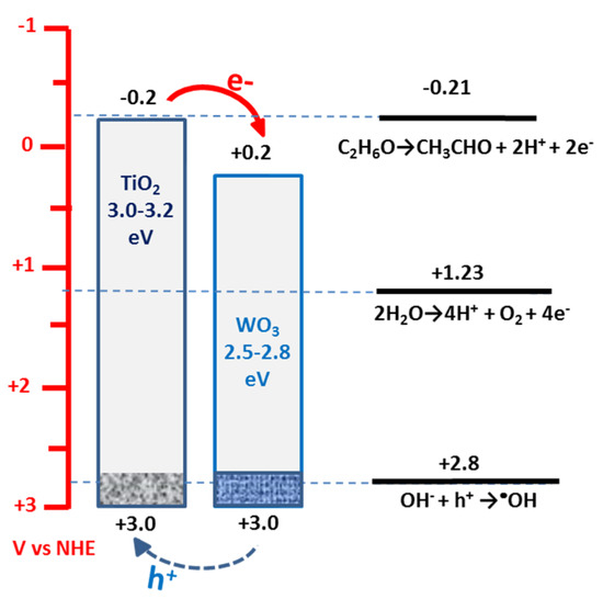 At this point, a question arises about the fate of the photogenerated holes. An approximate positioning of band levels for TiO2 and WO3 nanoparticulate semiconductors and of the oxidation potentials of the three possible hole scavengers in the present system is presented by the diagram in Figure 6 (cf. also the band levels in [23]). Titania nanoparticles used for the present application were a mixture of anatase and rutile. For this reason, the valence band level could not be clear cut and was expected to lie between 3.0 and 2.8 V vs. NHE. A similar situation existed for WO3 due to the fact that its bandgap may range between 2.5 and 2.8 eV, as already said. This created an uncertainty concerning the direction of the hole transfer. In Figure 6, we favored the transfer of holes to titania, which, being on the top, facilitated the interaction with hole scavengers in the solution. In view of structural imperfections in both semiconductors, it was hard to make a strong assertion on this matter. In any case, the level of 3.0 V vs. NHE was positive enough to produce •OH radicals. However, vast losses, again due to structural imperfections, may make transfer of holes to OH- ions less probable than the most obvious hole scavenging by ethanol or water. Oxidation of ethanol, as already said, is easier than water therefore, ethanol remained the most probable hole consumer.
