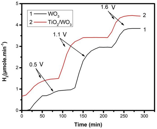 The hydrogen production rate by employing the two types of photoanode was indeed monitored, and the results are presented in Figure 7. In Figure 7, we tried to demonstrate the strong variation of the hydrogen production rate as a function of the applied bias. No hydrogen production was observed without a forward bias. Three different electric biases were applied, chosen within the above photocurrent range. Thus, each curve was divided into three parts, one for each applied bias, as marked on the graph. Each part demonstrated a period of a rising rate followed by a period of a practically constant rate. A fast increase of the hydrogen production rate took place after changing the applied bias, and it corresponded to the filling of tubes and detection device with the additional hydrogen produced. The variation of the hydrogen production rate with applied bias was a clear demonstration that hydrogen produced by reduction reactions at the cathode depended on the current flowing through the external circuit of the cell. Indeed, by comparing Curve #2 of Figure 4 with Curve #2 of Figure 7, it is found that the hydrogen produced was roughly proportional to the current. In addition, the combined TiO2/WO3 photoanode produced a higher quantity of hydrogen than the WO3 photoanode, in accordance with the higher current flow. The maximum hydrogen production rate recorded under the present conditions, with 1.6 V bias vs. Ag/AgCl, was 4.4 µmol.min-1. The corresponding current was 24.3 mA. The Faradaic efficiency for hydrogen production under the present conditions could be calculated by the following equivalent [32]: 1 µmole/min H2 corresponds to (10−6 moles) × (6.022 × 1023 molecules/mole) × (2 electrons/H2 molecule) × (1.6 × 10−19 Coulomb/electron)/60 s, which is equal to 3.21 mA. Consequently, 4.4 µmole.min−1 correspond to 14.1 mA. Since the average real current was 24.3 mA, then the Faradaic efficiency was 58% (14.1/24.3 = 0.58). The Faradaic efficiency depended on the device configuration and reactor parameters, as well as the efficiency of the cathode electrode and the quality of the electrocatalyst. The presently obtained value was relatively low, owed mainly to the use of an inexpensive electrocatalyst (carbon paper loaded with carbon black), but also to the fact that the reactor parameters were not optimized. Comparable Faradaic efficiencies were also obtained in a previous work [32]. It must be stressed at this point that the quality of the photoanode and the strength of the applied bias mainly dictated the flowing current, while the functionality of the cathode electrode mainly affected the Faradaic efficiency. It relied then mainly on the counter electrode to improve Faradaic efficiency, and this will be a matter of our future projects.