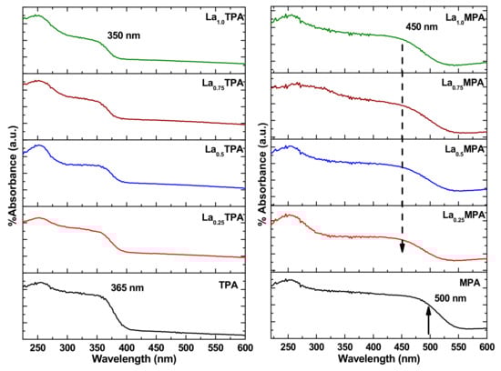 xTPA samples. The wide absorption peak (due to LMCT) wavelength value of MPA and La