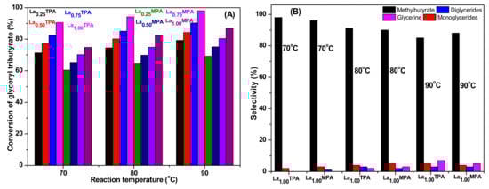 The selectivities of the products observed are in accordance with different reaction steps of transesterification of glyceryl tributyrate, as shown in Equations (1)–(3). It was clear that initially the triglycerides converts into diglycerides, and subsequently into monoglycerides and glycerin. At low conversions, the selectivity to methyl butyrate is between 96% and 98% in the case of highly active La1.00TPA and La1.00MPA catalysts. The selectivity to methyl butyrate was slightly lowered at high reaction temperatures, due to the formation of more glycerin. Low selectivity to monoglyceride was observed due to the fact that monoglyceride has a tendency to convert into methyl butyrate and glycerin. It was observed that a maximum of 7% selectivity to glycerin occurred for La1.0TPA sample.