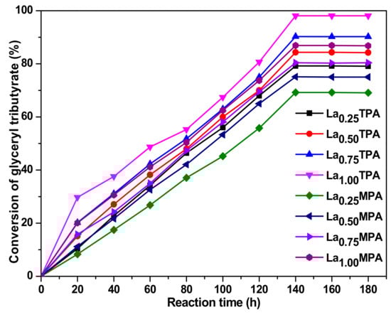 1.00TPA sample exhibited 90.5%, 94.2%, and 98.1% of glyceryl tributyrate conversion at 70 °C, 80 °C, and 90 °C, respectively, after 150 min of reaction time. On other hand, the La