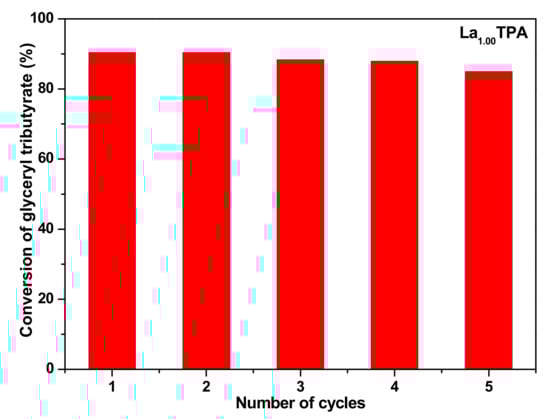 1.00TPA sample offered a very similar conversion of glyceryl tributyrate without any significant loss. However, after the fourth cycle there was a slight decrease in the conversion of glyceryl tributyrate, this is possibly because of a loss of catalyst amount throughout the recovery and regeneration steps.