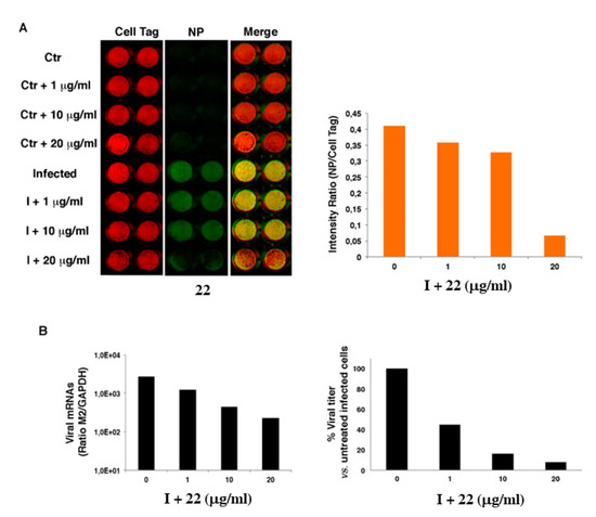 The anti-influenza efficacy of stilbenes, such as resveratrol and its analogues, has been previously reported by our group [24,48]. In order to better identify the antiviral mechanism of chalcone 22, we decided to study the expression of viral nucleoprotein (NP) by ICW assay and the viral RNA expression of Matrix 2 (M2), by Real-Time PCR. For the ICW assay, infected confluent monolayers were fixed and permeabilized as described in methods, treated with different concentrations of chalcone 22 (1.0, 10 and 20 μg/mL) and successively incubated with anti-NP antibodies. At the same time, cell monolayers were stained with cell tag (a dye of cell proteins used for the normalization of viral protein expression).