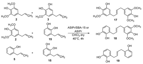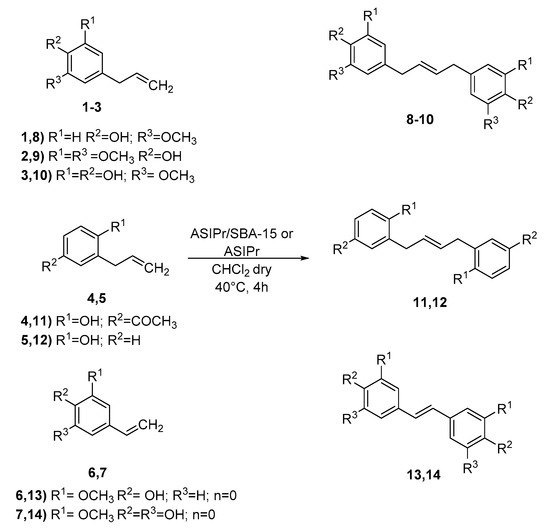 Initially, ASIPr/SBA-15 was used for the self-metathesis of allyl- and vinyl-benzene derivatives, including eugenol 1, 4-allyl-2,6-dimethoxyphenol 2, 4-allyl-2-hydroxy-6-methoxyphenol 3, 3-allyl-4-hydroxyacetophenone 4, 2-allyl-phenol 5, 4-vinyl-2-methoxy-phenol (4-vinyl-guaiacol) 6, and 4-vinyl-2-hydroxy-6-methoxy-phenol 7. The reactions were performed by treating the appropriate substrate (0.6 mmol) in dry CH2Cl2 (5.0 mL) with a catalytic amount of ASIPr/SBA-15 (2.0 × 10−3 mmol of immobilized Ru, corresponding to 8.8 mg of heterogenous catalyst) of under argon atmosphere at 40 °C for 4 h.