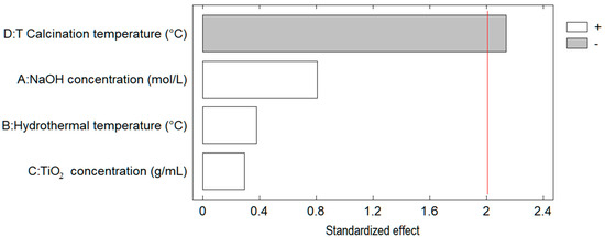 Statistical analysis of the experimental design (using Statgraphics Centurion XV® version 15.1.02 from Statgraphics Technologies, inc., Virginia, VA, USA) showed that, under a 95% significance level, the calcination temperature is the most influential factor in the formation of sodium titanates characterized by high catalytic performance for biodiesel production (Figure 1). In previous reports, the calcination temperature had been identified as the controlling factor in sodium titanates’ compositions. Morgado et al. [23] and Qamar et al. [24] separately reported the production of hydrated sodium trititanates with formula NaxH2-xTi3O7*nH2O or Na2Ti3O7*nH2O that were transformed into dehydrated sodium trititanate (Na2Ti3O7) and/or sodium hexatitanates (Na2Ti6O13), depending on the calcination temperature. On the other hand, Xiaoming and co-workers pointed out the effect of calcination temperature on sodium titanates, reporting the formation of sodium nonatitanate (Na2Ti9O19) at 600 °C and sodium hexatitanate at 850 °C [25].