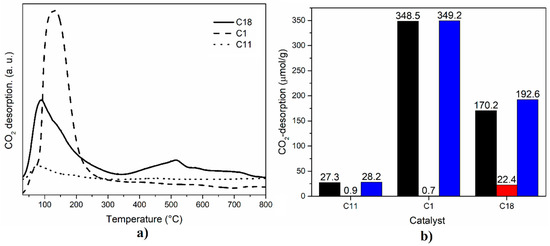 (a) TPD profiles and (b) basic sites-related CO2 desorption values for C1, C11, and C18 catalysts. Weak basic sites (black bar), medium–strong basic sites (red bar), and total basic sites (blue bar).