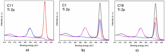 Ti 2p XPS spectra obtained for (a) C11, (b) C1, and (c) C18, catalysts.