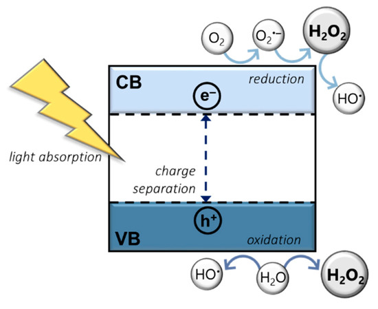 Photocatalytic activation and formation of reactive oxygen species in the presence of oxygen (O2) and water (H2O). H2O2 = hydrogen peroxide; O2•– = superoxide radical; HO• = hydroxyl radical; VB = valence band; CB = conduction band; e− = electrons; h+ = photogenerated holes.