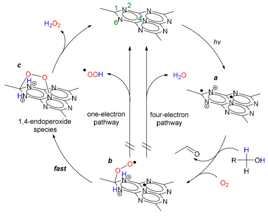 To improve H2O2 synthesis with photoactive CN, it is necessary to understand the reactions that take place at the photocatalyst surface. The pathway for H2O2 synthesis using CN photocatalysts is generally ascribed to the capacity of this material to drive two-electron oxygen reduction. Figure 2 represents the photoactivation of CN with visible light and the mechanism for H2O2 production suggested by Shiraishi et al. [94]. The authors propose that the electron/hole pairs are localized in the 1, 4 and 2, 6 positions highlighted in Figure 2, with the negatively charged sites attracting oxygen and later reacting with the trapped protons in nearby N atoms. Then, a selected alcohol is used as sacrificial agent. Photoexcited electrons react with O2, leading to the formation of the 1,4-endoperoxide species, which results in the liberation of H2O2. At the same time, a proton donor (e.g., an alcohol or water) undergoes oxidation and yields protons that contribute to generating H2O2 [76]. The efficient formation of the endoperoxide species suppresses one- and four-electron reduction of O2 (Equation (1), (2), respectively), improving the selectivity of two-electron reduction of O2 (Equation (3)). However, O2 on pristine CN preferably undergoes reduction to O2•‒ via one-electron reduction (Equation (1)), while on modified CN materials with more surface defects, a more facile production of H2O2 is achieved (Equation (3)) [95].
