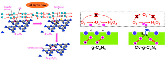 Li et al. [105] reported that H2O2 production can be improved up to 14 times in the absence of an organic electron scavenger in the presence of carbon-vacancies (Cv). This study revealed that a post-treatment with argon led to the destruction of the crystallinity of CN and, therefore, produce defects, i.e., carbon vacancies (Figure 3). The Cv enhanced the trapping of the photogenerated electrons. Moreover, amino groups were formed and promoted electron transfer and changed the H2O2 production pathway from two-electron direct reduction of O2 to sequential one-electron reduction of O2 (Figure 3). In addition, it was also found that Cv decreased the band gap energy but did not interfere with the CB potential. This study showed that the chemisorption of O2 on the catalyst was enhanced with this modification. The effect of nitrogen vacancies (Nv) was also assessed, with the H2O2 production being much lower than using materials with Cv. The highest H2O2 production rate obtained for CN-Cv and CN-Nv was 900 and 150 µmol gcat−1 h−1, respectively, under visible light (λ > 420 nm) irradiation.