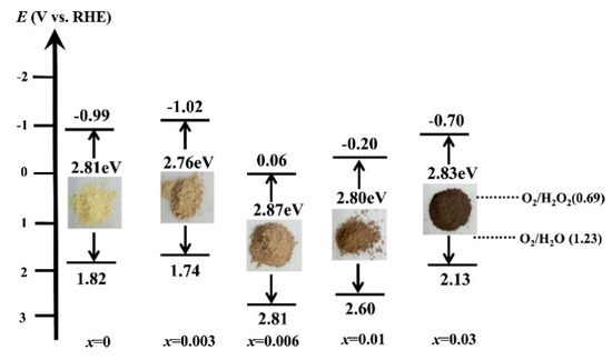 Energy levels of carbon (C)-doped CN (x denotes de carbon doping load). Reprinted with permission from reference [112]. Copyright 2018 Science Press and Dalian Institute of Chemical Physics, Chinese Academy of Sciences.