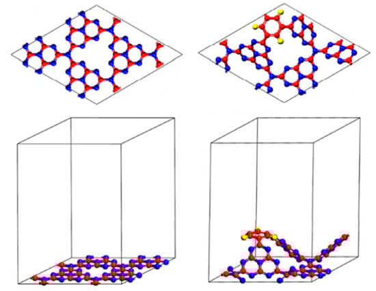 Top and side view of CN matrix before (left) and after distortion by benzene doping (right). Red, blue, and yellow represent carbon, nitrogen, and hydrogen atoms, respectively. Adapted with permission from reference [114]. Copyright 2017 American Chemical Society.