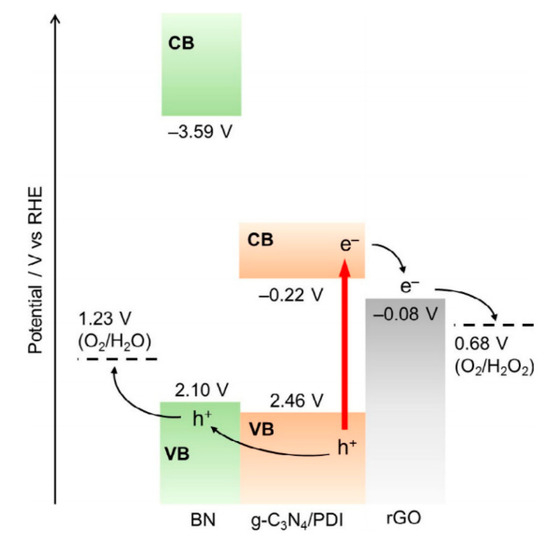 Energy diagram of the CN-PDI-reduced graphene oxide (rGO)- boron nitride (BN) catalyst. Reprinted with permission from reference [122]. Copyright 2018 Wiley-VCH Verlag GmbH & Co. KGaA, Weinheim, Germany.