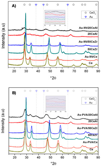 A similar colloidal route was used for the samples using PVA (Sigma Aldrich, Mw 31000, San Luis, MO USA) as the stabilizing agent (2 wt% Au, nominal value). A total of 10−3 M HAuCl4 solution was reduced with NaBH4 in presence of PVA in Au:PVA, mass ratio of 1.5:1 and the obtained colloid was immobilized over the supports. The solids were then filtered, washed and dried at 80 °C for 24 h and calcined in air at 350 °C for 4 h with 3 °C/min−1 heating rate. The catalysts received the labels Au-PVA/Ce, Au-PVA/50CeZr, and Au-PVA/20CeAl, respectively.