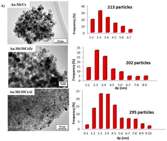 The TEM analysis, seen in Figure 2, showed that the calculated average particle size, seen in Table 1, was not affected by the stabilizing agent but by the support. The gold particles were smaller on the bare ceria support than on its mixed analogues.