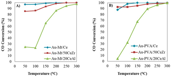 The reaction of CO oxidation is often described as very sensitive to the gold metal state (loadings and dispersion) and to the nature of the support [33,34]. The CO oxidation activity in terms of the light off conversion curves is presented in Figure 3.