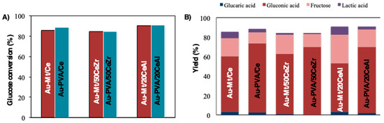 (A) Glucose conversion (%) as a function of the temperature over Au-Mt/Ce (600 rpm, 18 h); (B) yield (%).