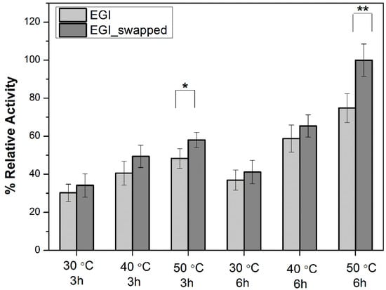 Figure 2. The enzyme activity profiles of EGI and EGI_swapped enzymes toward CMC for 3 h and 6 h at 30–50 °C (/10 °C). Data are express as mean ± SD, n = 3. p-values between 0.1 and 0.05, and p-value smaller than 0.05 are indicated with ‘*’ and ‘**’ on plots, respectively.