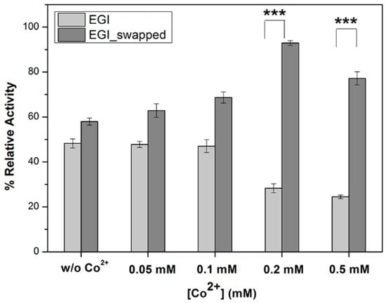 Figure 3. The effects of Co2+-ion pre-incubation with enzymes prior to hydrolysis reaction on their enzymatic activity profiles. Through enzyme assays toward 0.5% w/v CMC, the impacts of Co2+ ion pre-incubation with enzymes were investigated for different Co2+ ion concentrations, 0 mM, 0.05 mM, 0.1 mM, 0.2 mM and 0.5 mM, in final. The highest data among all activity tests, EGI_swapped at 50 °C for 6 h, is taken as 100% to calculate the rest. Data are express as mean ± SD, n = 3. To indicate the significant differences in enzymatic activities of EGI and EGI_swapped enzymes, p-value smaller than 0.001 are indicated with ‘***’ on plots.