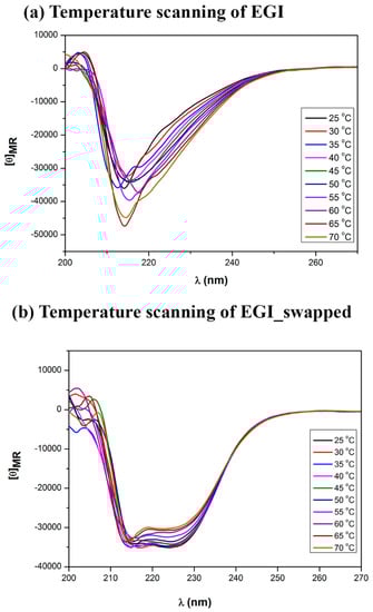 The altered enzymatic activity and thermal stability results in the swapped enzyme have already pointed out that domain swapping should transform the secondary structure of the EGI significantly. Now we use Circular Dichroism (CD) spectroscopy approach in order to evaluate the possible structural variations of EGI_swapped and EGI enzymes. The temperature sweep of CD spectra between 25 °C and 70 °C reveals distinct conformational and thermal susceptibility between the secondary structure of EGI and EGI_swapped enzymes, see Figure 5a,b. EGI enzyme shows antiparallel β-sheet features in the spectra region of 210–240 nm with a distinctive peak ca. 215 nm. In contrast, EGI_swapped demonstrates the superposition of an antiparallel β-sheet at ca. 215 nm and α-helix like features at ca. 225 nm [37]. Peculiarly, temperature dependent CD study reveals that the structure of EGI enzyme significantly changes with increasing temperature. Although the maxima of ca. 215 is increased slightly, the structural changes exhibit a significant broadening at ca. 230 nm. These structural changes correlate with the temperature dependent activity assays of EGI enzyme. Increasing temperature induces critical alterations in the secondary structure of EGI enzyme, and prolonged temperature exposures could render the enzyme completely inert as shown in Figure 4a.