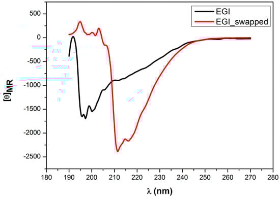 Figure 6. The CD spectroscopy measurement of EGI and EGI_swapped enzymes after 1 h denaturation at 95 °C. Through Circular Dichroism, the change in structures of EGI and EGI_swapped was carefully traced between 195 nm and 230 nm after 1-h heat denaturation at 95 °C and 3-h incubation at room temperature. The CD measurement was performed at room temperature with samples prepared in 20 mM sodium acetate buffer (pH 4.7) that was corrected for the backgrounds. For EGI_swapped, the peaks at 211 nm and 216 nm are indicated. All results are displayed in mean residue ellipticity ([θ]).