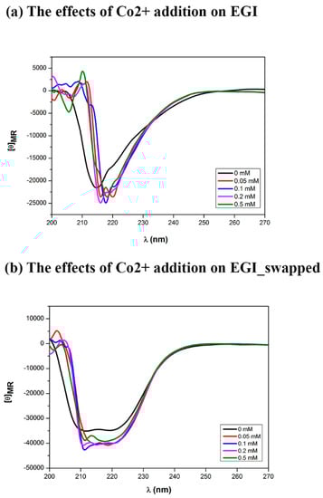Figure 7. The effects of Co2+ ion addition on secondary structures of EGI and EGI_swapped enzymes. Through Circular Dichroism, the differences in secondary structures of EGI (a) and EGI_swapped (b) upon Co2+ ion addition have been captured within 210–220 nm and 215–230 nm, respectively. Protein samples were prepared in 50 mM sodium acetate buffer (pH 4.7) that was corrected for background at room temperature. All results are displayed in mean residue ellipticity ([θ]).