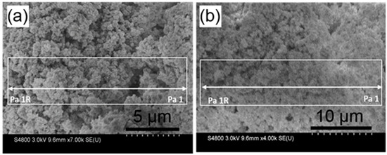 The field emission scanning electron microscopy (FESEM) image clearly shows the surface morphology of the Bipy–PMO and Pd@Bipy–PMO (periodic mesoporous organosilica structure) hybrid catalysts. As seen in Figure 1a,b, pure PMO and Pd–PMO presented a cabbage-like smooth morphology. These were observed in the form of agglomerates formed through the stacking of porous SiO2. The incorporation of ionic liquids (ILs) onto Bipy–PMO structure, related to rod-like SBA–15 morphology, resulted in assembles of materials formed by polar bipyridinium IL distributed over the entire surface of the silicate skeletons.