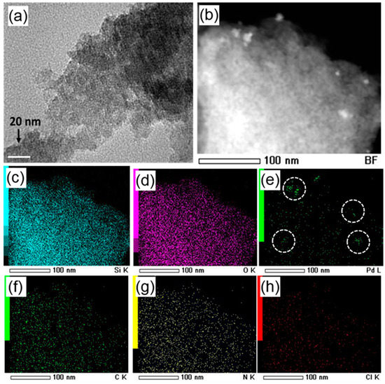 Figure 2 shows the transmission electron microscopy (TEM) images obtained at high-angle annular dark-field scanning transmission electron microscopy (HAADF–STEM) for Pd@Bipy–PMO, clarifying the presence of Pd nanoparticles within the PMO pores. TEM-elemental mapping images of the Pd@Bipy–PMO were clearly revealed the successful incorporation of the Si, O, C, N, Cl, and Pd species over the Bipy–PMO support (Figure 2).
