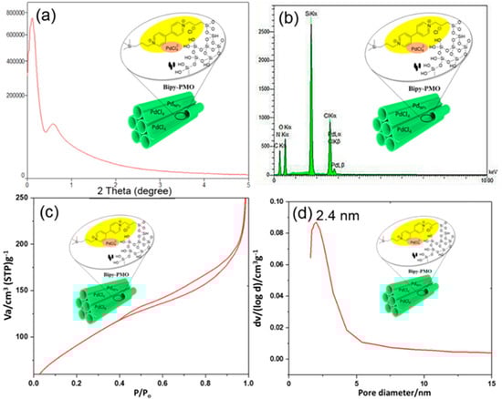 Small angle X–ray diffraction (SAXRD) pattern of Pd@Bipy–PMO shows one sharp peak at 2θ = 0.34° which originates from the periodicity of the mesoporous structure (Figure 3a). The existence of the related elements including Si, O, N, C, Cl, and Pd was varified by energy–dispersive X–ray spectroscopy (EDX, Figure 3b). The nitrogen adsorption–desorption isotherms (BET) of the Pd@Bipy–PMO was also performed to investigate their textural properties and pore size regularity (Figure 3c,d). BET illustrates the same type IV nitrogen adsorption–desorption isotherm with an H1 hysteresis loop for mesoporous materials according to IUPAC classification. Moreover, the Barrett–Joyner–Halenda (BJH) pore size distribution isotherms showed a singlet sharp peak for materials. The pore-size distribution has its maximum at 2.4 nm, as shown in Figure 3d.