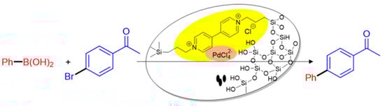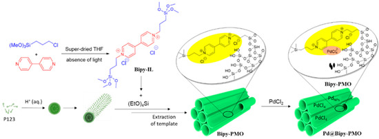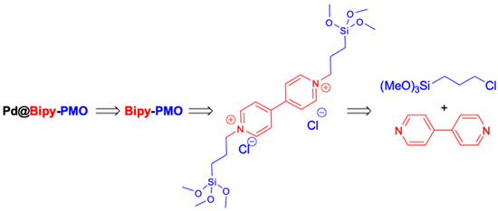 After the report of periodic mesoporous organosilica structures (PMOs) as new class of hybrid mesoporous organosilica materials, a wide range of precursors have been used to synthesize new mesoporous structures [19,20]. It is noteworthy that due to the particular properties and importance of the ionic liquids (ILs), their combination with PMOs produces fabulous hybrid catalysts [21,22]. Herein, we first designed and synthesized a new ionic liquid bipyridinium linker (1,1′–Bis[3–(trimethoxysilyl)propyl]–4,4′–bipyridinium chloride), which was used as a novel bridge for the preparation of dimeric IL-based bipyridinium skeleton PMO (Scheme 1). Then, we applied the Bipy–PMO as a support for immobilization of the Pd species envisioning its high catalytic activity for Suzuki reaction in water. The yield and selectivity of the corresponding delivered cross-coupling products were also found to be excellent.