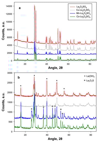 In Figure 1a X-ray diffraction (XRD) patterns of fresh La2O2SO4 and transition metal-promoted La2O2SO4 are reported. All spectra show the characteristic lines of monoclinic lanthanum oxysulfate (JCPDS 085-1535). The presence of the transition metals causes a decrease of crystallinity, as shown by the lower intensity of XRD peaks, which is particularly evident for the case of Co-La2O2SO4. As mentioned in the Introduction, the structure of La2O2SO4 consists of alternating stacks of La2O22+ layers and layers of anions SO42− [12,15], therefore the possible inclusion of the transition metal into the lattice can generate a distortion since the radius of the transition metal ion differs from that of La3+ (1.03 Å). Notably, for the same oxidation state (including the metallic state), cobalt shows the smallest dimensions. In particular, the ionic radius of Me3+, supposed to substitute La3+ in the lattice, is 0.60 Å for cobalt and 0.70 Å for manganese. Copper, which is generally in the +2 oxidation state, has a ionic radius as Cu2+ similar to Mn3+ (0.73Å). That could explain the lowest crystallinity of the Co-La2O2SO4 material.