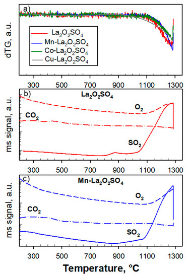 The effect of metal doping on the thermal stability of La2O2SO4 has been studied by thermogravimetry-mass spectrometry (TG-MS) experiments ramping up to 1300 °C at 10 °C/min under N2 flow: the corresponding derivative weight loss plots (Figure 2a) are superimposed and flat for all materials, indicating an almost constant weight up to ca. 1050 °C. Above this temperature, which corresponds well to the decomposition temperature previously reported for La oxysulfate [21], all materials experience a significant weight loss, at similar increasing rates up to 1300 °C, where the process is not yet completed (during 10 min under isothermal conditions). Accordingly, the MS traces for SO2 (m/z = 64), O2 (m/z = 32) and CO2 (m/z = 48) in the evolved gas display similar trends for undoped La2O2SO4 (Figure 2b) as well as for metal- doped materials (exemplified in Figure 2c for the case of Mn-La2O2SO4). In particular, a limited CO2 release can be observed in the temperature range of 250–500 °C corresponding to the decomposition of same superficial La- carbonates. A rather small SO2 peak in the range of 800–950 °C suggests the decomposition of some residual La sulfates. Eventually, a large SO2 release begins at temperatures around 1050 °C, which is accompanied by the evolution of O2, thus suggesting the occurrence of La oxysulfate decomposition to La2O3. Poston et al. [21] detected (by XRD analysis) the simultaneous formation of La2O3 and La2O2S phases during thermal treatment of La2O2SO4 at T ≥ 1050 °C in air. According to our results, the oxygen release never occurs independently from SO2. Therefore, it can be concluded that under N2 flow none of the doped or undoped La oxysulfates is able to release oxygen and turns spontaneously into the corresponding oxysulfide without decomposing.