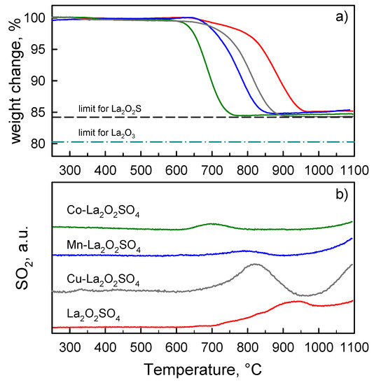 Small differences are due to some impurities, such as carbonates, which are present in the original samples (Figure 2b,c). In contrast, the complete transformation of La2O2SO4 into La2O3 would account for a weight loss as large as 19.8%. The onset temperature of weight loss associated with the reduction of La2O2SO4 (ca.630 °C) is not affected by doping with Cu or Mn, whereas Co addition lowers it by 30 °C (Table 2). However, all transition metal (oxides) dopants act as a catalyst to facilitate the surface reaction with the reducing gas, confirming the order of activity is Cu < Mn < Co.