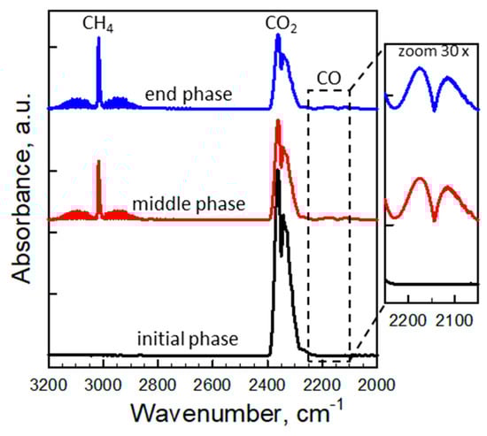 Thereafter, the intensity of the CO2 signal declines, as a consequence of a reduction in the lattice oxygen mobility/availability and, therefore, in the overall reaction rate. Notably, the appearance of a weak doublet band at 2170–2115 cm−1 (insert of Figure 7) indicates the formation of only small amounts of CO in addition to CO2 via the partial oxidation of methane (Equation (5)), while the characteristic band centered at 3020 cm−1 is associated to increasing amounts of unconverted methane. As expected, a comparison of IR spectra of all OCs (not shown) highlights that the order of deep oxidation rate of methane follows the same trend of lattice oxygen mobility/availability in the OC materials.