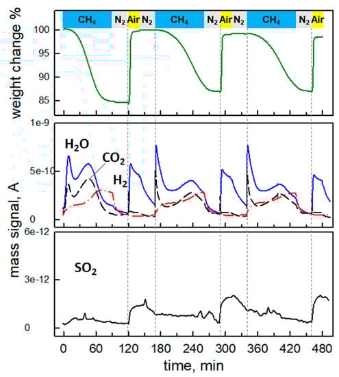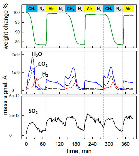 Considering the high oxygen mobility in Co-La2O2SO4, the cyclic anaerobic oxidation of methane has been tested also at 800 °C and 750 °C in order to verify if the adverse impact of decomposition reactions (Equations (6) and (7)) could be limited. Results are shown in Figure 9 and Figure 10, respectively. As expected, at 800 °C the reduction of the oxysulfate takes place at a slower rate but the corresponding weight loss is completed within ca. 30 min under CH4 flow. Accordingly, water and CO2 are produced during the whole reduction phase, resulting in wider emission peaks than at 900 °C. Some H2 appears only at the end of this step, but is not accompanied by any detectable weight increase. It is inferred that CH4 decomposition does not significantly proceed at 800 °C, whereas some methane partial oxidation can occur when lattice oxygen from the OC is almost completely exploited. The SO2 emission during the reduction step at 800 °C is at least one order of magnitude lower than at 900 °C, confirming the hypothesis on the beneficial effect of a lower reaction temperature to limit the decomposition of the oxysulfate into the corresponding oxide. Re-oxidation under air at 800 °C is still very rapid, and the weight recovery is almost complete. However, the second (and third) reduction step is slower than the first one so that the transformation into the oxysulfide phase ends only during the purging step. As a consequence, CO2 and H2O profiles show broader peaks with similar area but lower maxima with respect to the first cycle and shifted towards the end of the period. The SO2 emission during reoxidation remains quite low. The results of the third cycle are repeatable.