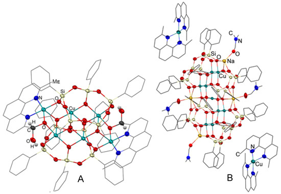 Features of cage Cu-CLMSs’ interaction with N,N-ligand (neocuproine). Left: Compound A with silsesquioxane and neocuproine ligands as parts of the same unit (Ref. [37]). Right: Ionic complex B with copper ions redistributed between silsesquioxane and neocuproine ligands (Ref. [38]). CLMS: cage metallasilsesquioxanes.