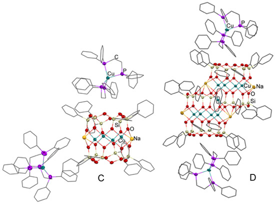 Ionic complexes with copper ions redistributed between silsesquioxane and 1,2-bis(diphenylphosphino)ethane ligands (Ref. [39]). Left: Compound C with four copper(II) ions in the cage unit. Right: Compound D with nine copper(II) ions in the cage unit.