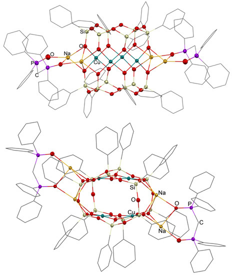 - Kulakova, A.N.; Bilyachenko, A.N.; Korlyukov, A.A.; Shul’pina, L.S.; Bantreil, X.; Lamaty, F.; Shubina, E.S.; Levitsky, M.M.; Ikonnikov, N.S.; Shul’pin, G.B. A new “bicycle helmet”-like copper(II),sodiumphenylsilsesquioxane. Synthesis, structure and catalytic activity. Dalton Trans. 2018, 47, 15666–15669. [Google Scholar] [CrossRef] [PubMed]